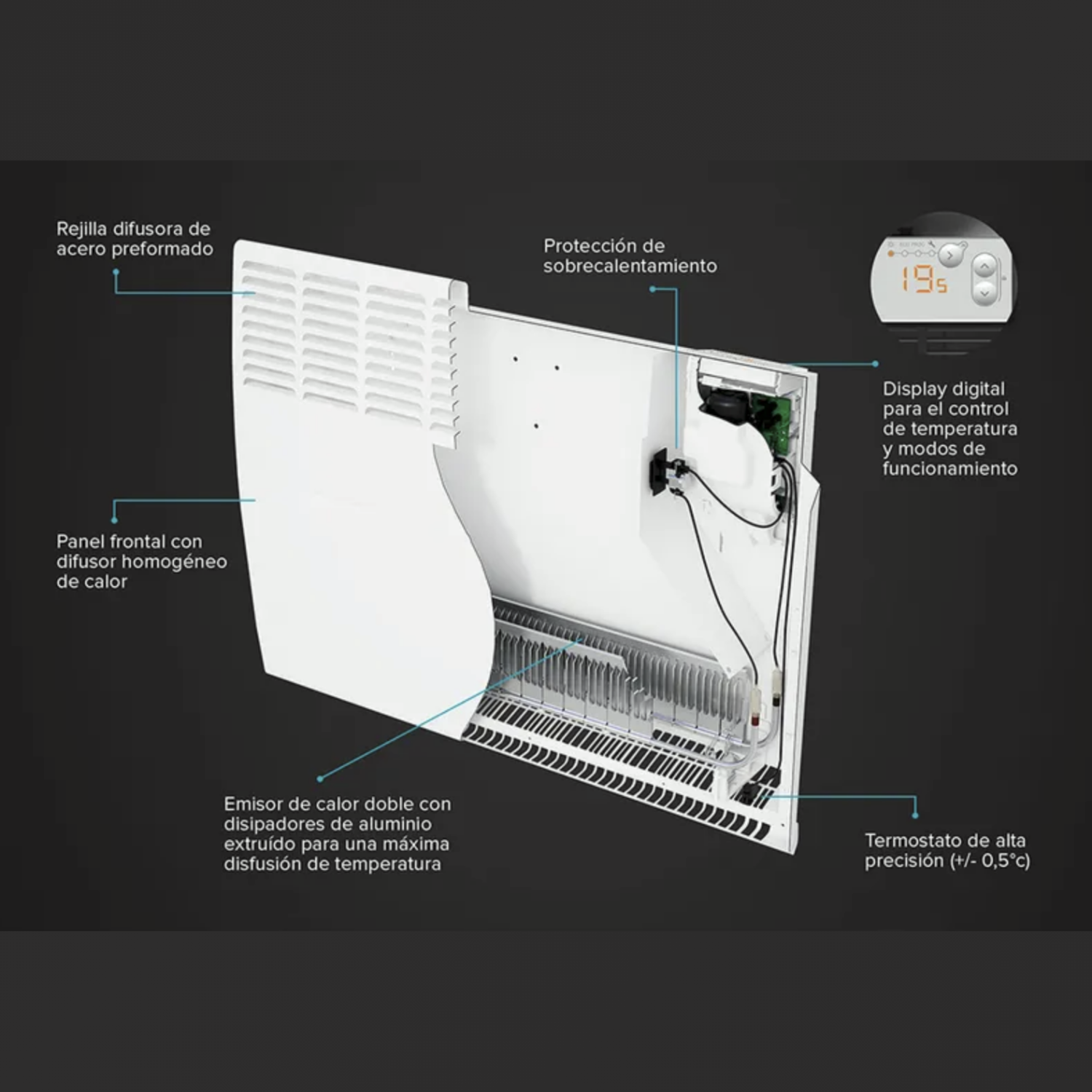 El Calefactor Atlantic F120 es la solución ideal para quienes buscan una calefacción eficiente y moderna. Disponible en versiones de 1000W y 1500W, cubre áreas desde 25 m² hasta 35 m², dependiendo del modelo adquirido. Su diseño delgado y elegante se adapta a cualquier espacio, y su panel frontal HD garantiza una difusión homogénea del calor. Cuenta con un panel digital que permite programar su funcionamiento 24/7, adaptándose a tu ritmo de vida. Además, incorpora funciones de seguridad como protección contra sobrecalentamiento y sistema antivuelco. Con un ahorro energético de hasta un 25%, debido al rápido ascenso de la temperatura al encenderlo y sus componentes de la más avanzada tecnología que evitan pérdidas de calor, es la opción ecológica y silenciosa para mantener tu hogar cálido durante el invierno.
