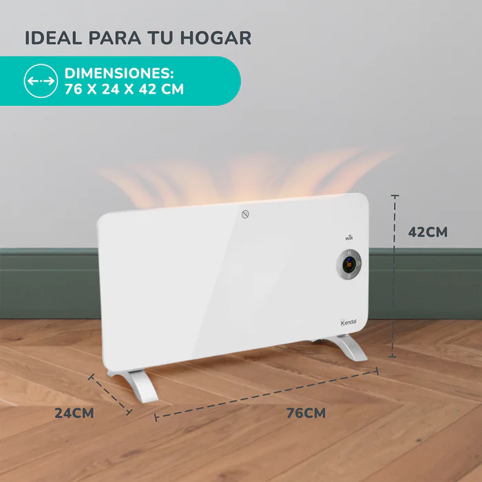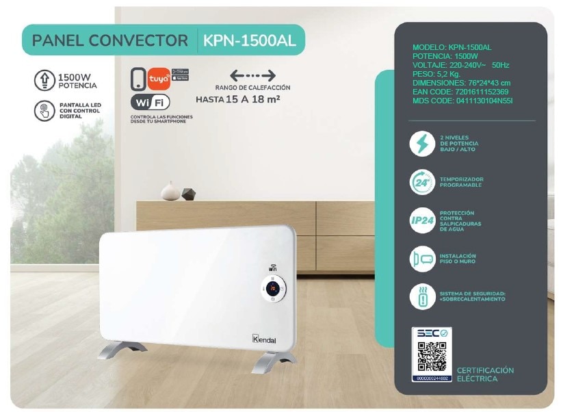 El Panel Convector Eléctrico KPN-1500AL con WiFi de Kendal es la solución perfecta para calefaccionar espacios de hasta 18 m² con eficiencia, seguridad y elegancia. Gracias a su sistema de convección natural, entrega un calor suave y uniforme, ideal para dormitorios, oficinas o salas de estar. Su diseño en aluminio, moderno y discreto, permite instalación mural o sobre el piso, adaptándose fácilmente a cualquier ambiente.
