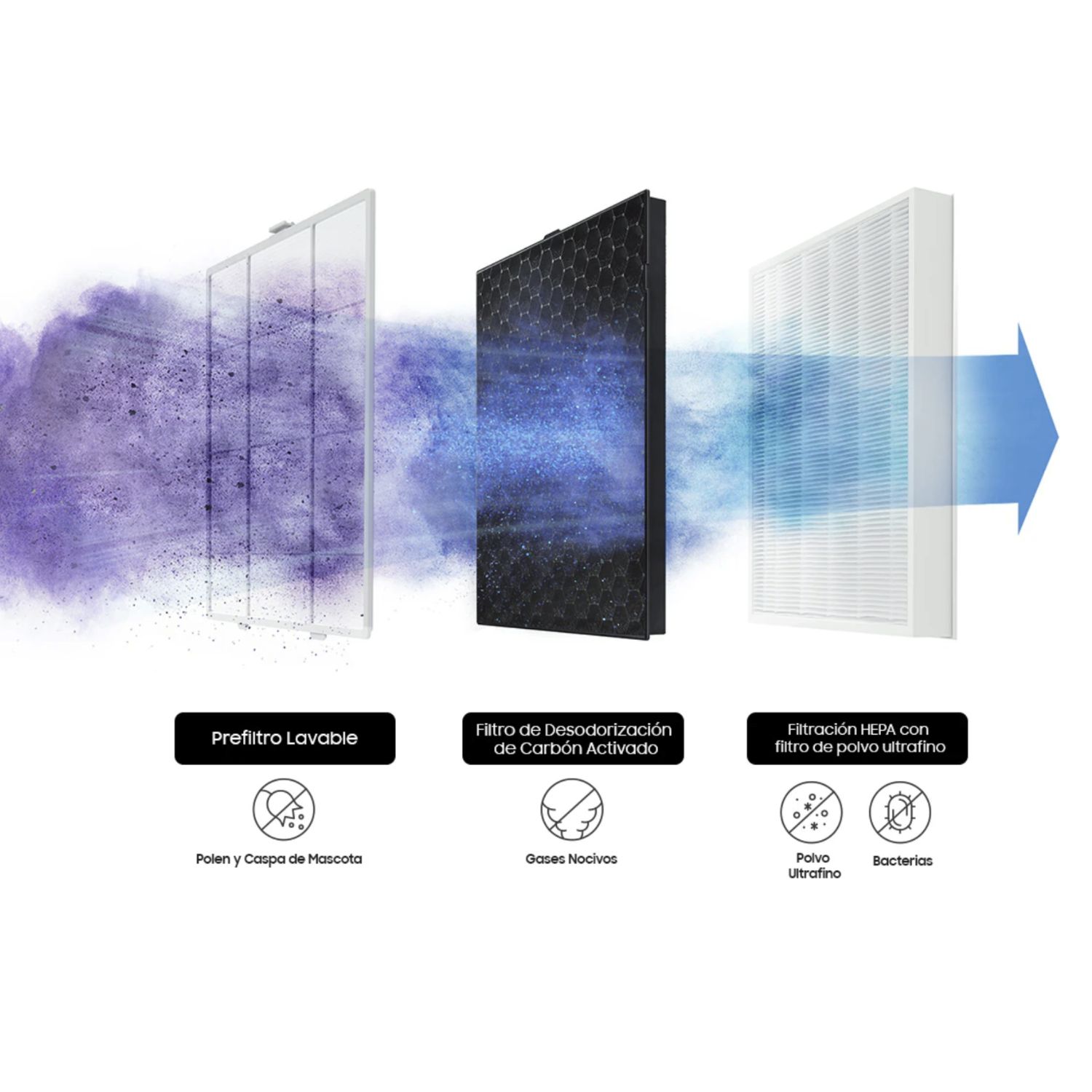 Sistema de filtrado triple con filtro HEPA, que elimina hasta el 99,97% de partículas finas y alérgenos.